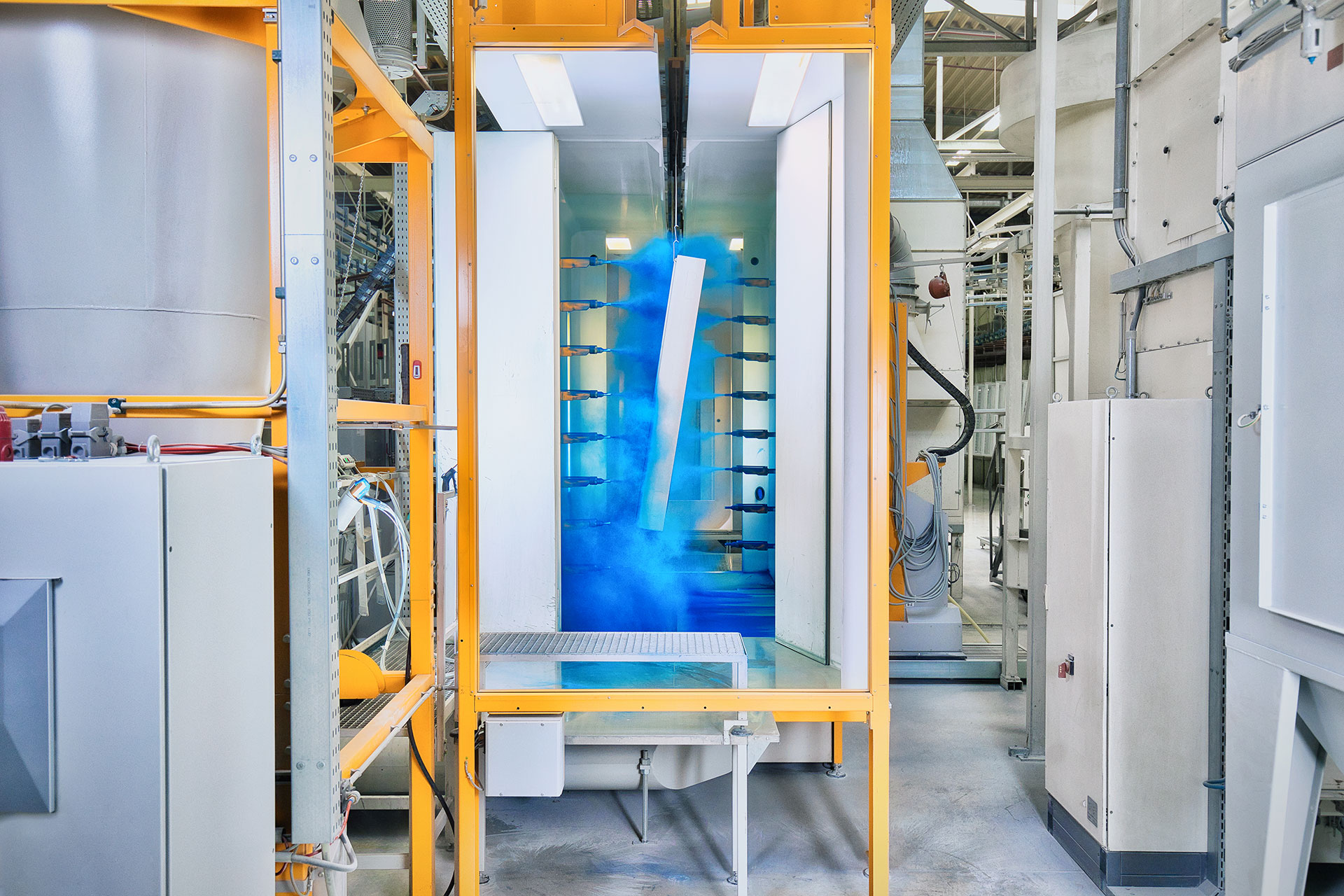 Der kontinuierliche Fertigungsprozess in der Pulverbeschichtungsanlage wird aufgrund der drei Beschichtungskabinen und einem unabhängigen Zweikreissystem bei einem Farbwechsel nicht gestört. Mehr als 90 unterschiedliche Farben, die regelmäßig auf Kundenwunsch verarbeitet werden, haben aus einer vormaligen Sonderbeschichtung den Normalfall für unsere Fertigung gemacht. Unsere Kunden schätzen diesbezüglich unsere hohe Flexibilität in Punkto Qualität und Lieferzeit.